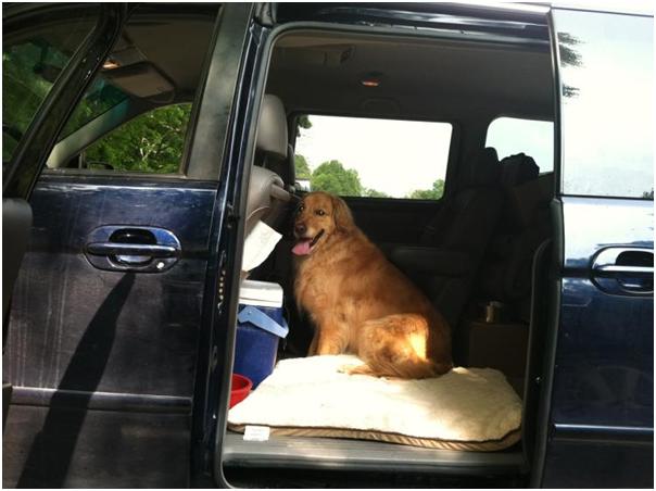 We stopped for our evening meal at a very clean diner with rows of gas pumps out front. The food was uninspired but passable and Jackson waited patiently in the shaded car. When we got ready to leave, we gave him his food and water and he seemed fine. However, when Ric shut the door and stepped over to say something to me in the other car, he panicked. He had panicked once before in his life – when his collar got caught on the dishwasher rack while he was trying to lick silverware as I loaded dishes. That time, he ran headlong for the door in terror with the rack still attached to his collar and dishes flying every direction. He also initiated a “fight or flight” response that is thankfully very rare. In clinical terms he “expressed his anal glands”. Cats can do this too. It is a spray of scented fluid designed to repel an attacker and although it didn’t phase the dishwasher rack, it sure repelled us. The smell is one you never forget. It was bad in our kitchen, very bad, but it was even worse in the confines of a vehicle. Thankfully, his own bed took the brunt of the outburst. We begged a black trash bag from that sterile diner to stuff the bed cover into and I stood in front of a rapt audience of fueling drivers wiping down Golden Retriever “tail feathers” with facial cleansing wipes from my cosmetics bag. Then it occurred to me to use some of my hair finishing spray to further mask the odor. It smells good and comes in a bright pink can which undoubtedly helped make it an entertaining encore for the facial wipes. Ric drove the next thirty miles of Interstate with the windows down while poor Josh and Si suffered in the back with the panting beast. Hopefully they aren’t scarred for life.