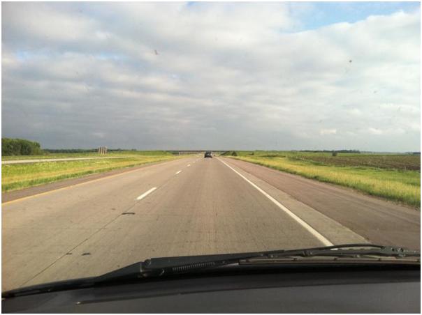 We continued down I-29 and witnessed the corresponding consequences of all the late-season green in South Dakota. Water was much higher everywhere than it should have been, especially along the river. Trees that looked pretty tall were half submerged and sections of interstate were diverted in several places. I had been puzzling the prior day over how water can find its way to where it needs to go when land is so flat. Apparently every depression in the landscape is fair game.